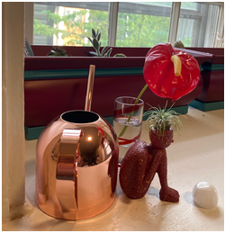 A short but fun message today. One of the funny things I do around my house is make little impromptu altars all over the place. You probably do that too? This one happened when my flowering anthurium plant fell over and one of the stems broke. These flowers last a loooooong time, both live and cut. So I popped in a pretty shot glass someone gave me, added a couple other items and created a contemplative mini-altar tableaux. It’s cute, isn’t it? When I pass by it makes me smile and a smile is such a great meditation.